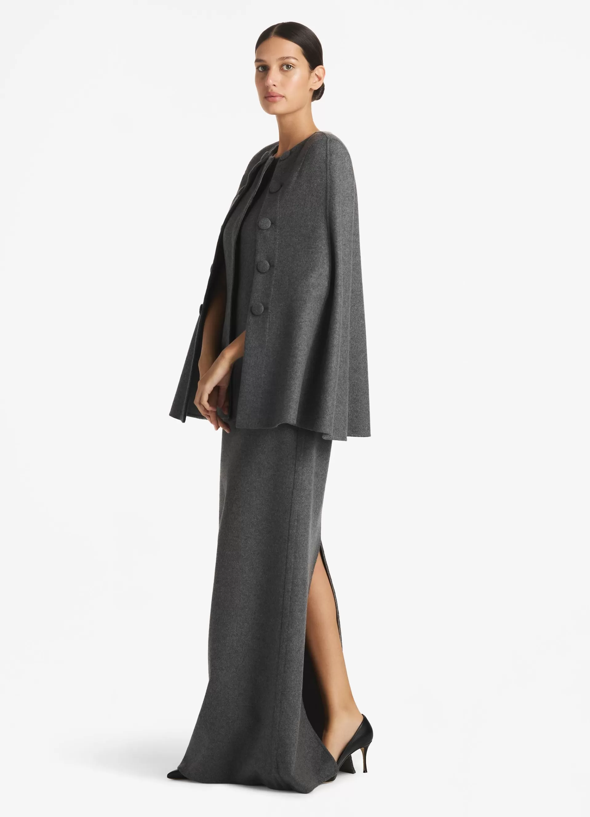 Effortless elegance abounds in this double face wool and cashmere blend cape jacket with covered buttons decorating the …